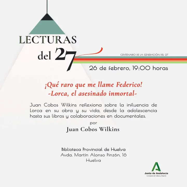 El acto contará con la participación del escritor y poeta onubense Juan Cobos Wilkins, quien impartirá la conferencia titulada “¡Qué raro que me llame Federico! –Lorca, el asesinado inmortal–”. La intervención abordará la figura y el legado de Federico García Lorca, uno de los máximos exponentes de aquel movimiento literario y cultural que marcó la historia de la literatura española del siglo XX.