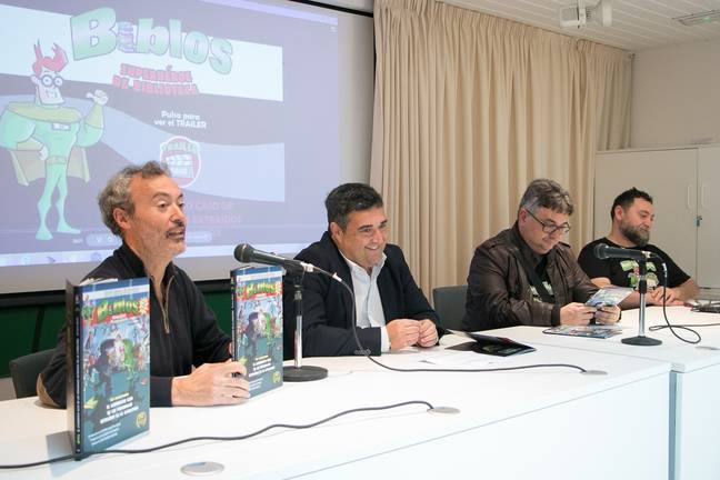 El delegado territorial de Cultura y Patrimonio Histórico, José Manuel Correa, acompañado del director de la Biblioteca Pública Provincial de Huelva, Antonio Agustín Gómez, y de Gerardo y Ciro Macías (Hermanos Macías), ha presentado la reedición del primer número del cómic “Biblos, superhéroe de biblioteca”, que ha sido incluida por la Consejería de Cultura y Patrimonio Histórico dentro de su Programa Anual de Publicaciones a propuesta de la Biblioteca Provincial de Huelva.