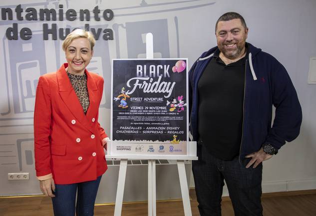 La concejala de Comercio y Mercados del Ayuntamiento de Huelva, Tania González, y el presidente de la Agrupación de Comerciantes Calles del Centro, Carlos Moral, han presentado el programa de animación del Black Friday, al que se han sumado también la agrupación de comerciantes de La Merced. Un evento comercial que se extenderá del viernes al domingo y que, bajo el lema Street Adventure, incluye diferentes actividades de animación y descuentos de hasta el 70%.