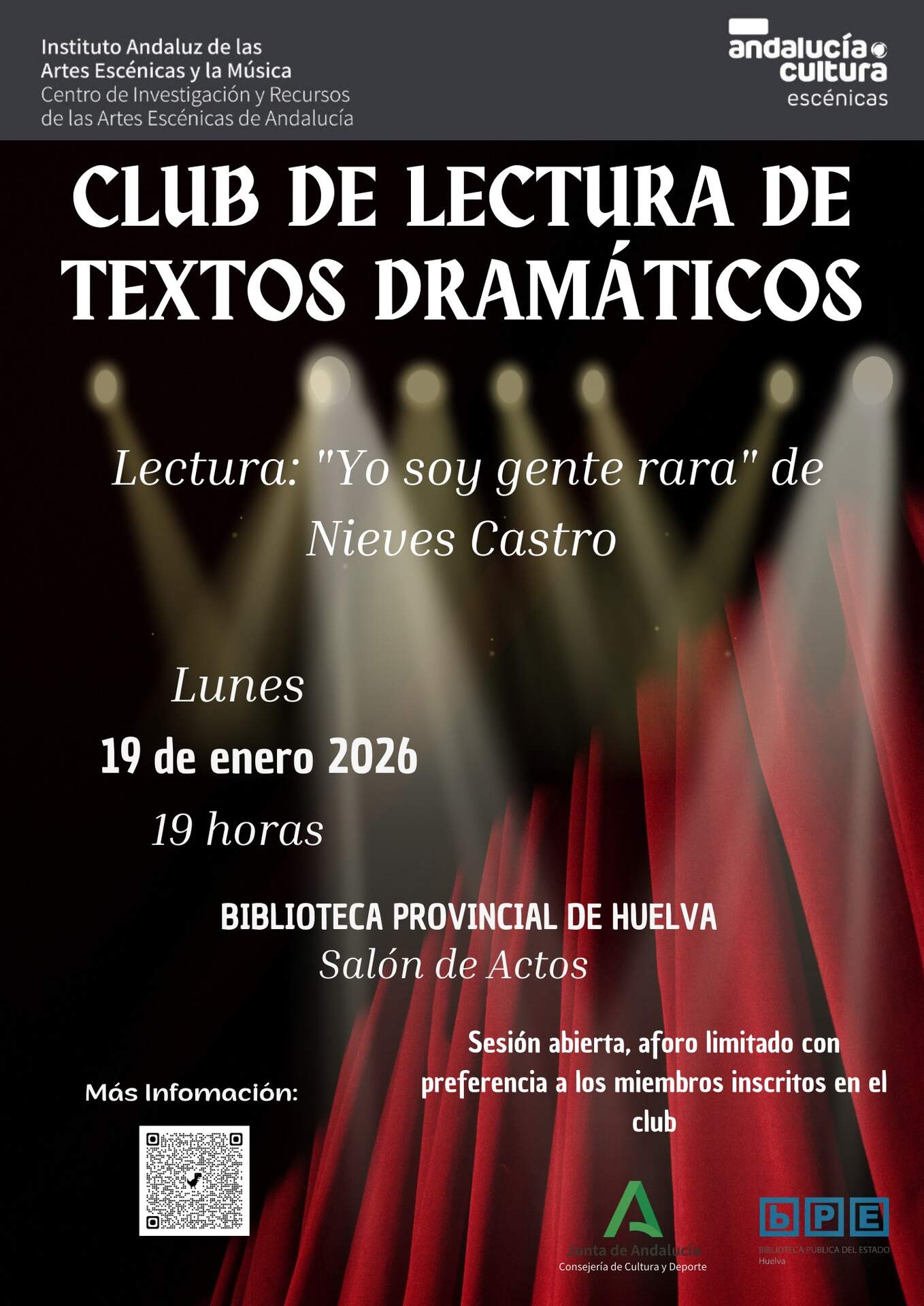 La Biblioteca Provincial de Huelva acogerá el próximo lunes, 19 de enero, una nueva sesión del Club de Lectura de Textos Dramáticos, una iniciativa cultural abierta a todas las personas interesadas en el teatro y la lectura desde una perspectiva participativa.