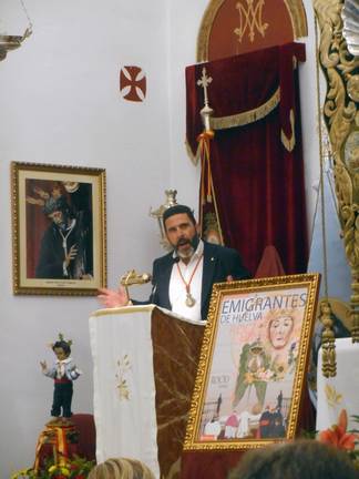 Continuaba su cátedra el director espiritual recordando los orígenes de Emigrantes: “Esta Concha Peregrina que en Alemania/ mantuvo la fe encendida/ en el corazón de los emigrantes./ Los primeros que soñaron/ con volver de nuevo a rezarte./ Con volver de nuevo a ponerse/ ante tu bendito semblante/ con el corazón lleno de Rocío/ porque era un corazón Emigrante./ Con el tiempo la Concha volvió a tu tierra,/ buscó una casa entre nosotros/ igual que Tú con José/ buscabais un lugar en Belén,/ un lugar donde encontrar reposo/ para que naciera tu Bien/ y darle al mundo ese gozo./ Buscabas una casa en esta ciudad/ porque elegiste a Huelva, donde te quisiste quedar./ Calle Blanca Paloma,/ Aljaraque y por fin/ en el barrio de las Colonias/ donde un cura humilde/ te abrió las puertas de su casa”.
