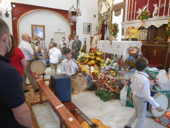 Entran en la capilla de la Real Hermandad de Emigrantes de Nuestra Señora del Rocío los tamborileros que. con su flauta y tamboril, anuncian el inicio de una noche de Rocío única y para el recuerdo para todos los hermanos y devotos de la Concha Peregrina gracias a las voces del grupo Retama y la exaltación del capellán y director espiritual de Emigrantes, José Manuel Barral.