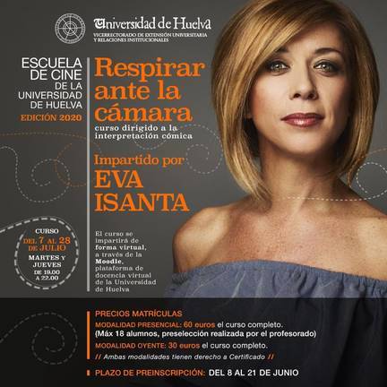 El Área de Cultura de la Universidad de Huelva ha abierto el plazo de preinscripción para participar en el Curso de Verano de la Escuela de Cine de la UHU, que tendrá como protagonista a la actriz Eva Isanta, uno de los rostros más icónicos de la televisión por sus carismáticos personajes en las series de comedia Aquí no hay quien viva y La que se avecina, así como reconocida por su carrera teatral y cinematográfica, y que será la encargada de impartir la formación ‘Respirar ante la cámara’, donde aportará su gran experiencia y dará a los alumnos las claves esenciales para la interpretación cómica.