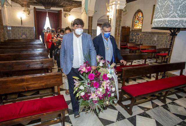 Los integrantes de la Corporación de Huelva, con el alcalde, Gabriel Cruz, a la cabeza ha visitado el Santuario de la Patrona de Huelva para participar en la tradicional Ofrenda Floral a la Virgen Chiquita.