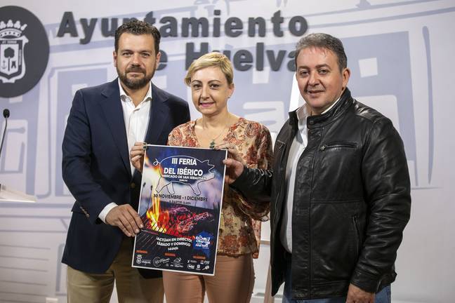 La concejala de Comercio y Mercados del Ayuntamiento de Huelva, Tania González; y el presidente de la Asociación de Comerciantes del Mercado de San Sebastián, Juan Carlos Salguero, han presentado hoy la III Feria del Ibérico, que tendrá lugar el próximo fin de semana en el Mercado de San Sebastián.