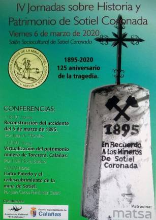 La Asociación de Amigos de la Mina de Sotiel Coronada continúa organizando actividades culturales para la comarca. En esta ocasión, propone para el viernes día 6 de marzo las IV Jornadas sobre Historia y Patrimonio de la localidad, con el patrocinio de Matsa y la colaboración del Ayuntamiento de Calañas y la Asociación Cultural El Calabazar. La edición estará dedicada al 125 aniversario de la tragedia acaecida en la zona en 1895, comenzando los actos a las 18.30 horas en el Salón Sociocultural de Sotiel Coronada.