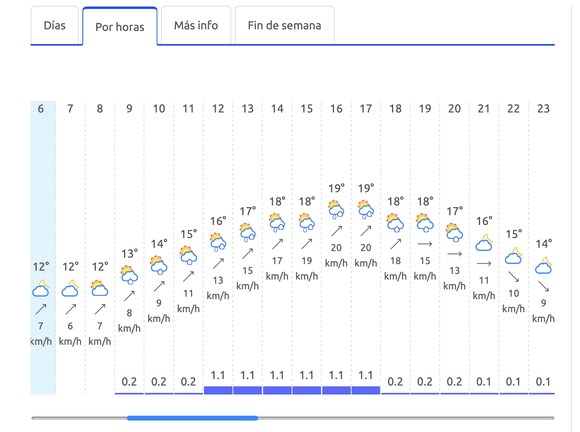 A priori los cielos amanecerían despejados y, conforme avance la tarde se podrían registrar las primeras precipitaciones intermitentes y poco intensas a partir de la una de la tarde, que vendrá acompañado de ligeras rachas de viento y con una nubosidad del 70%. Así lo acredita el grafico de eltiempo.es que acompaña a esta información.