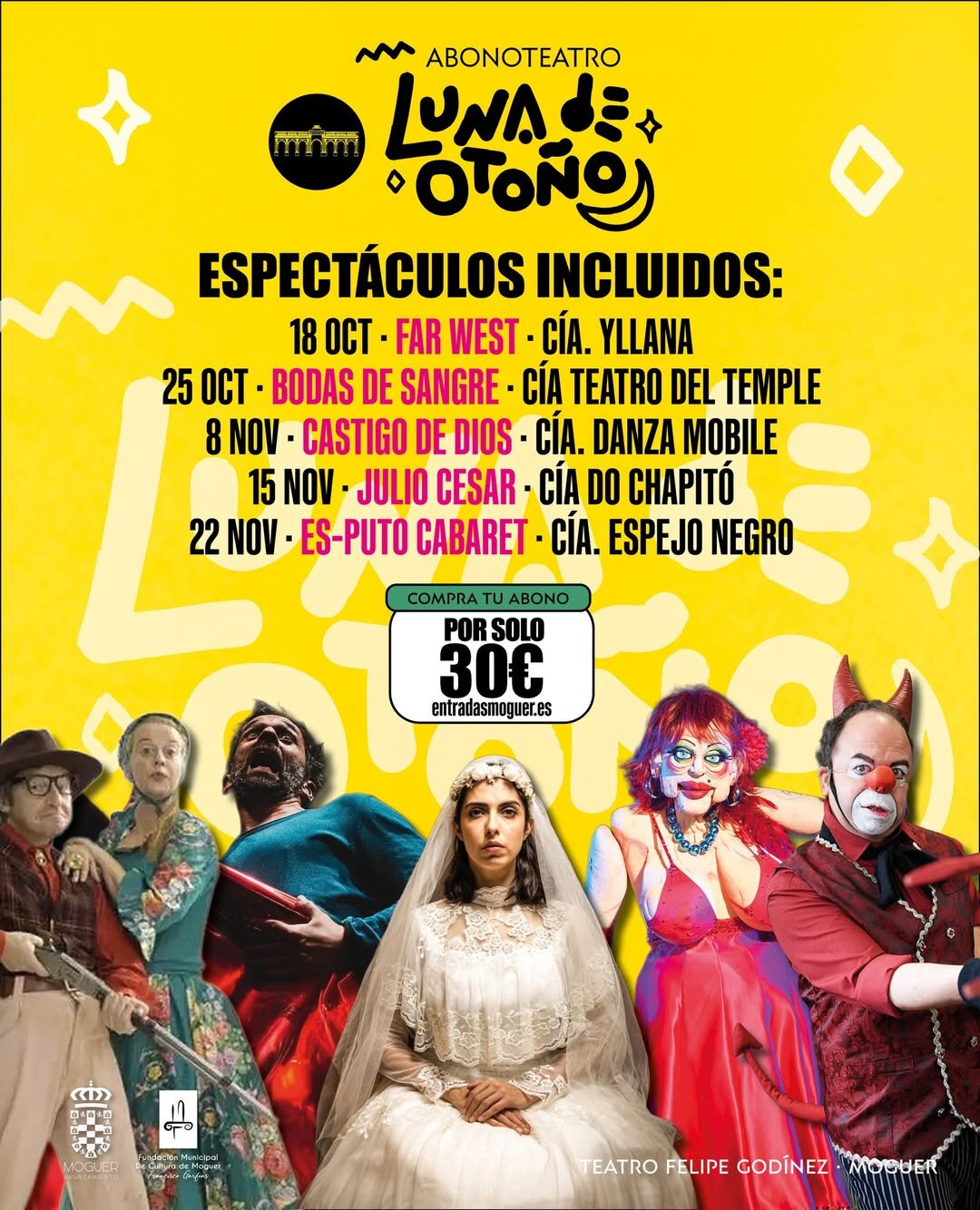 El Ayuntamiento de Moguer, a través de la Fundación Municipal de Cultura, ha puesto ya a la venta el abono para la nueva edición del ciclo ‘Luna de Otoño’, una de las citas escénicas más esperadas del calendario cultural moguereño. Por un precio único de 30 euros, los espectadores podrán disfrutar de cinco espectáculos de primer nivel que llenarán de teatro, humor y emoción el escenario del teatro Felipe Godínez durante los próximos meses.