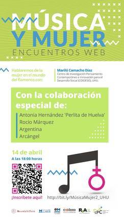 El encuentro se celebrará en la plataforma Zoom el próximo miércoles 14 de abril de 2021, previa inscripción en https://bit.ly/MusicaMujer2_UHU, y será retransmitido en directo por las redes sociales de las entidades que impulsan el proyecto.