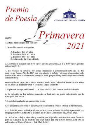 El plazo para la presentación de los poemas finaliza el 21 de marzo, coincidiendo con el Día Internacional de la Poesía, y deberán ser remitidos por correo electrónico a cultura@puntaumbria.es o entregarlos en papel al Centro Cultural, especificando que es “para el Premio de Poesía de Primavera 2021”.