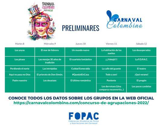 Una vez finalizado el plazo para cambios de grupos, en la fase preliminar del Carnaval Colombino 2022, éste será el orden de actuación de la primera fase del concurso, que comenzará el día 8 y finalizará el día 12 de febrero.