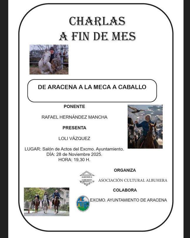 La Asociación Albuhera retoma este viernes sus Charlas a fin de mes con la experiencia del aventurero Rafael Hernández Mancha, que contará su particular travesía ‘De Aracena a La Meca a caballo’. La actividad se desarrollará en el Salón de Actos de la Plaza de Doña Elvira a partir de las 19:30 horas.