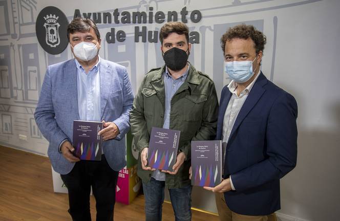 El alcalde de Huelva, Gabriel Cruz; acompañado del teniente alcalde de Cultura, Daniel Mantero, ha presentado esta mañana en el Ayuntamiento el libro ‘La Semana Santa de Huelva. Significaciones, Instrumentalizaciones y Ritualidad’ del doctor en Antropología Social José Carlos Mancha, que se ha alzado con el XX Premio de Investigación Diego Díaz Hierro. Un libro del que se han editado 300 ejemplares por parte del Consistorio.