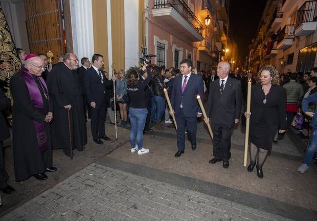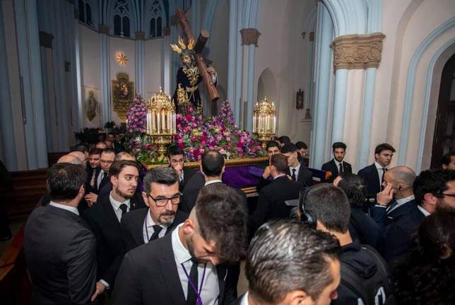 El rezo presidido por el Señor de las Penas ha finalizado en la iglesia de Santa María de la Esperanza, donde permanecerá hasta el sábado 14 de marzo, día en que se produzca la salida extraordinaria hacia la Isla Chica, su barrio, que lo verá de nuevo procesionar el 6 de abril en el Lunes Santo.