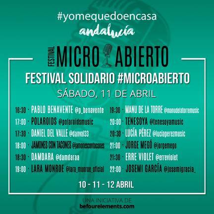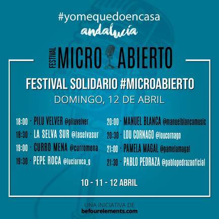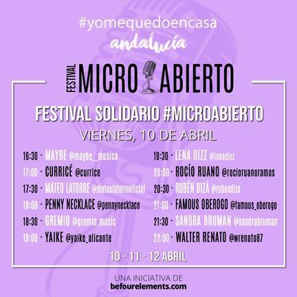 Para este fin de semana 10, 11 y 12 de Abril las onubenses están organizando el Festival Solidario #MicroAbierto en Instagram con 32 artistas, entre los que destacan Famous Oberogo (ganador de Operación Triunfo 2018), Daniel Del Valle (tenor del Coro Real Español), Pepe Roca (Grupo Alameda), Curricé o Walter Renato (del programa Factor X) entre otros.