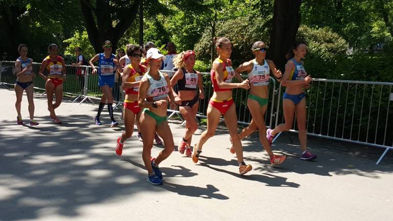 La marchadora lepera estalla de felicidad tras conseguir una histórica medalla de bronce en la prueba de los 20 kilómetros marcha de la Copa de Europa.