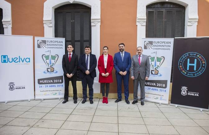 El alcalde de Huelva, Gabriel Cruz; el consejero de Turismo y Deporte de la Junta de Andalucía, Francisco Javier Fernández; la Campeona Olímpica, del Mundo y Europa, Carolina Marín; y el presidente de la Federación Española de Bádminton, David Cabello, han presentado esta mañana en la Casa Colón, el Campeonato de Europa Absoluto ‘Huelva 2018’, que se celebrará del 24 al 29 de abril en el Palacio de los Deportes ‘Carolina Marín’.