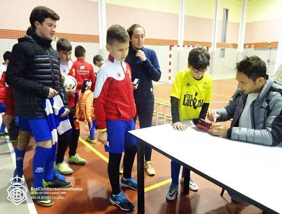 De este modo, el máximo goleador del Decano pregonó la fe albiazul entre los jóvenes deportistas de Lucena del Puerto, mientras el centrocampista y el lateral hicieron lo propio en el Colegio La Hispanidad de Huelva.