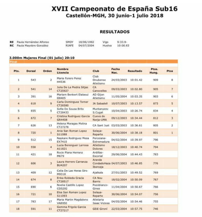 La discípula del entrenador Manuel Pulido acreditó un tiempo en meta de 10 minutos, 1 segundo y 42 centésimas (10:01.42), superando a Julia de la Piedra (CA Canovelles, 10:02.80) y Mariam Benkert (AD Gijón, 10:03.35).