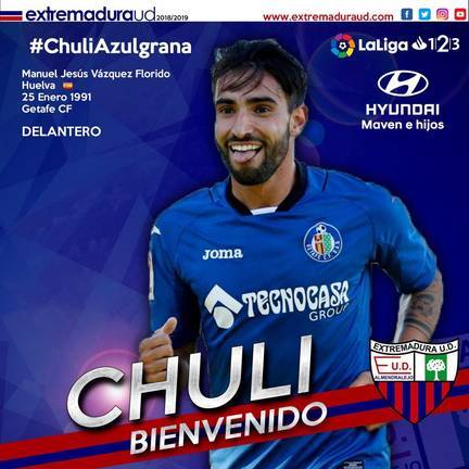 Otro futbolista onubense que cambia de aires. Manuel Jesús Vázquez Florido 'Chuli' se ha convertido esta tarde en nuevo jugador del Extremadura UD, al que llega en calidad de cedido por el Getafe. El delantero, que ya actuara en el Lugo durante la segunda mitad del curso pasado, se mantiene por tanto en la Segunda División.