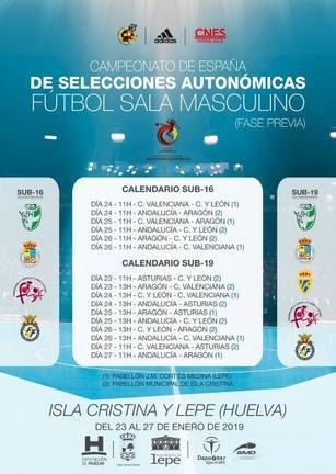 Isla Cristina y Lepe albergarán los días 23 a 27 de este mes la Fase Previa del Campeonato de España de Selecciones Autonómicas de Fútbol Sala, para las categorías sub-16 y sub-19. El torneo reunirá a 150 deportistas y se espera una afluencia de 800 visitantes, con su consiguiente repercusión económica para los citados municipios.