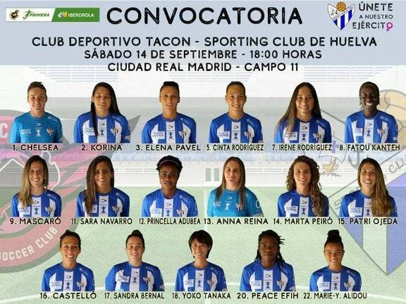 Para este primer desplazamiento de la campaña, el técnico onubense pierde por lesión a Natalia Nogareda, víctima de una tendinitis en su rodilla izquierda. A cambio, recupera a la central Patri Ojeda, que se ausentó del debut liguero por una sanción que arrastraba del curso pasado. De nuevo, la canterana Anna Reina será la portero reserva, pues la recién llegada Selena Babb no ha entrado en la convocatoria.
