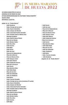 Será un circuito llano, arropado del viento por los edificios de la ciudad y que pasará por los lugar más emblemáticos de Huelva. Los organizadores esperan alcanzar la cifra de 500 participantes y habrá trofeos para los tres primeros clasificados de cada categoría. Estas son las calles por las que discurrirá la Media Maratón: