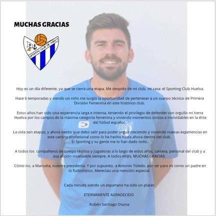 Ha sido uno de las claves de los éxitos del Sporting de Huelva, aunque apenas se le ha visto en la foto. Un héroe en la sombra que ahora ha decidido poner fin a su etapa en el club. Se trata de Rubén Osuna, quien ha desempeñado las funciones de analista durante las seis últimas temporadas en el máximo exponente del fútbol onubense.