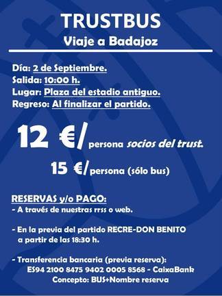 Son los casos de la Peña Recreativista Milenio o del Recreativo Supporters Trust, que ya han fletado un autobús para desplazarse a tierras pacenses. Y se espera que a lo largo de la semana se sumen más colectivos a esta iniciativa. La pasada temporada alrededor de 400 hinchas albiazules estuvieron presentes en las gradas del Nuevo Vivero.