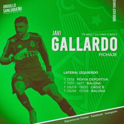 JAVI GALLARDO: Lateral zurdo de 29 años con siete temporadas de experiencia en la categoría de bronce. Nacido en La Línea (Cádiz), la pasada campaña militó en la Penya Deportiva. Con anterioridad jugó en La Balona y en el Cádiz B.