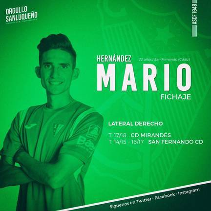 MARIO HERNÁNDEZ: Lateral derecho de 22 años, ha disputado dos temporadas en la Segunda División B. El curso pasado militó en el CD Mirandés y anteriormente fue canterano y jugador del primer equipo del San Fernando.