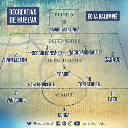 RECREATIVO: Marc Martínez; Iván Malón (Diego Jiménez, min.61), Sergio González, Nacho Monsalve, Casado; Traoré, Rafa de Vicente; Iván Agudo, Toni Segura (Álex Zambrano, min.71), Lazo; y Gorka Santamaría (Natalio, min.86).