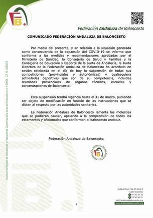 En un comunicado público, la Federación infirma que informa que "ha acordado la suspensión de todas sus competiciones (provinciales y autonómicas) y cualesquiera actividades deportivas que son de su competencia, incluidas reuniones presenciales de órganos técnicos, escuelas y concentraciones". Esta suspensión tendrá vigencia, en principio, hasta el 31 de marzo.