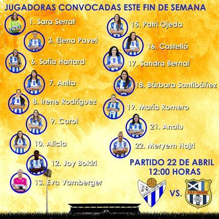 Con todo ello, la convocatoria estará formada por las guardametas Sara Serrat y Eva Vamberger, y las jugadoras de campo Elena Pavel, Sofía Hartard, Anita, Irene Rodríguez, Carol, Alicia, Patri Ojeda, Castelló, Sandra Bernal, Bárbara Santibáñez, María Romero, Analu, Hajri y Joy Bokiri.