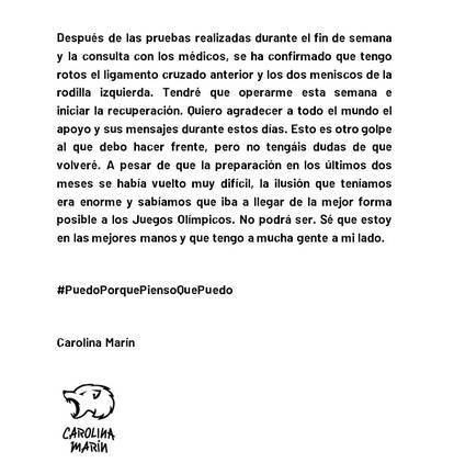 Carolina Marín confirma la peor de las noticias: adiós a los Juegos y al Mundial de Huelva