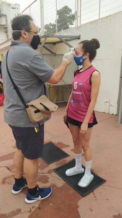 Mascarillas, controles de temperatura, desinfecciones de balones... son algunas de las medidas de seguridad que rodean a las sesiones de entrenamiento que tienen lugar los lunes, miércoles y jueves en las instalaciones del Colegio Santa Teresa de Jesús de la capital onubense.
