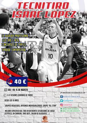 En la primera quincena de agosto contaremos con Isaac López, todo un ex-jugador profesional, para una actividad llamada 'TecniTiro Isaac López', donde profundizaremos en los detalles técnicos del fundamento del tiro en sus distintas facetas. Grupos reducidos y trabajo personalizado para una mayor mejora y rendimiento.