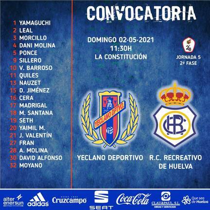 Hasta cuatro novedades presenta la convocatoria del Recreativo de Huelva para viajar hoy a Yecla, donde mañana el Decano visitará al Yeclano (La Constitución, 11.30 horas), en partido correspondiente a la quinta jornada de la Fase de Descenso a la Tercera RFEF. Yaimil Medina, Matheus Santana, Morcillo y el canterano Antonio Molina son las altas en la lista de Carlos Pouso, que al fin recupera para sus planes al extremo venezolano, segundo máximo goleador albiazul.