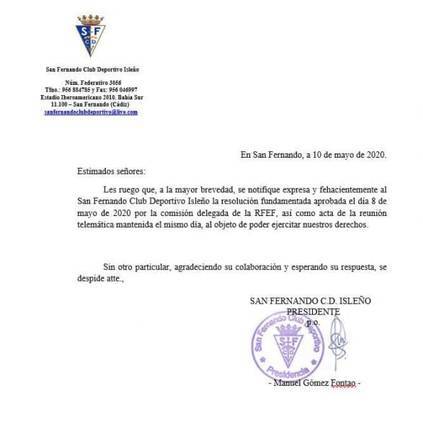 El San Fernando va en serio en su intención de denunciar a la Real Federación Española de Fútbol por la decisión de cancelar la liga regular en la Segunda B, sin descensos, pero permitiendo en cambio que los cuatro primeros clasificados cuando se suspendió el campeonato, disputen el 'play-off' de ascenso.