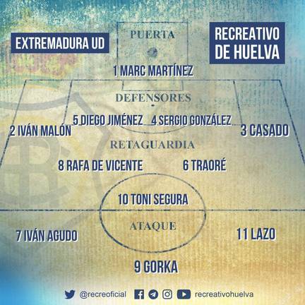 RECREATIVO: Marc Martínez; Iván Malón, Diego Jiménez, Sergio González, Casado; Rafa de Vicente, Traoré (Álex Zambrano, min.65); Iván Agudo (Natalio, min.65), Toni Segura (Boris, min.76), Lazo; y Gorka Santamaría.
