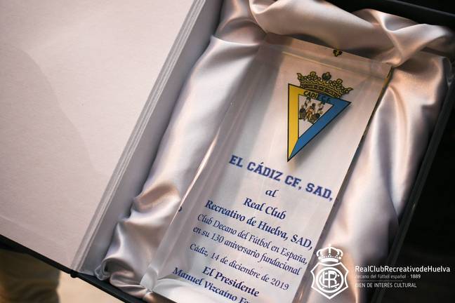 Un gran detalle del Cádiz CF. Aprovechando la visita de su filial al Nuevo Colombino y la celebración del 130º aniversario del Recreativo de Huelva, el equipo de La Tacita de Plata quiso obsequiar al Decano con un regalo conmemorativo de la efemérides.