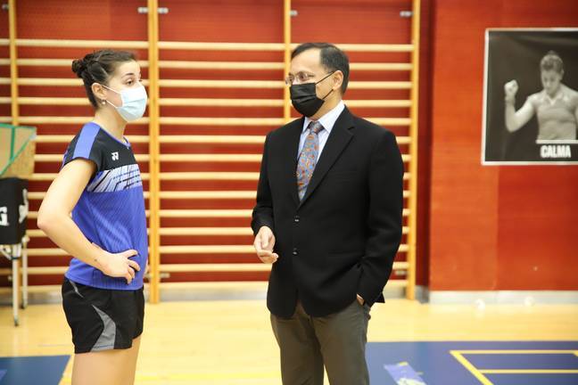 Para recibir al diplomático indio, Marín hizo una pausa en el proceso de recuperación de su grave lesión de rodilla, que le obligó a perderse los Juegos Olímpicos de Tokio y el Mundial de Huelva. Hace ya siete meses y medio que nuestra volantista no pisa una pista para competir, si bien, ha anunciado en sus redes sociales que su retorno a la competición está cada vez más cerca.