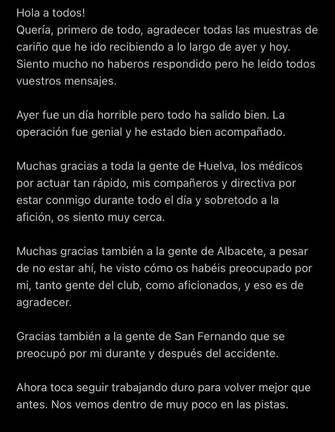 Una acción que provocó una queja pública del conjunto del Andrés Estrada y que pese a su gravedad, ni siquiera fue considerada falta antideportiva por los colegiados. Al menos, la escuadra gaditana ha tenido el detalle de mandar los "mejores deseos y ánimos al jugador Christian Seguí con la lesión sufrida durante el encuentro. ¡¡Pronta recuperación!!". Por su parte, Segui ha elegido la opción de pasar página y en una nota publicada en las redes sociales, califica lo sucedido como un "accidente".