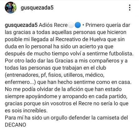 Habría sido un fichaje ideal, el candidato perfecto para ser el centrocampista que busca el secretario técnico Juan Antonio Zamora para reforzar la sala de máquinas albiazul. Pero Gus Quezada no volverá a vestir la elástica del Recreativo de Huelva. Al menos, en lo que a la próxima temporada se refiere.