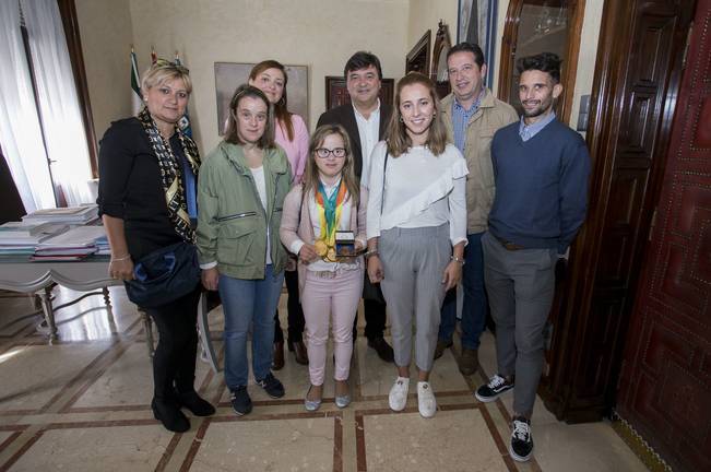 El alcalde de Huelva, Gabriel Cruz, acompañado de la concejala de Participación Ciudadana y Deportes, María Teresa Flores, ha recibido en el Ayuntamiento a Blanca Betanzos, atleta del Club Onubense de Deportes Adaptado que ha conseguido un excelente palmarés en los Campeonatos Mundiales de Atletismo para Personas con Discapacidad Intelectual, que se han celebrado recientemente en Brisbane, Australia.
