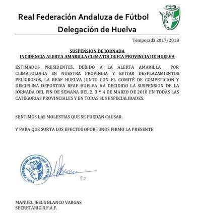 La Delegación Onubense de la Real Federación Andaluza de Fútbol ha decidido suspender por el temporal todos los partidos previstos para este viernes, sábado y domingo, pertenecientes a las categorías desde la Primera División Andaluza hasta Prebenjamines.