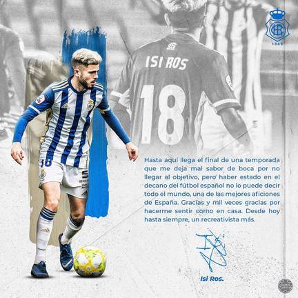 Y no habrá oportunidad de enmendarla, pues Isi Ros se ha despedido en las redes sociales del Recre y su afición. Es el segundo jugador en hacerlo, tras el mediocentro albanés Kleandro Lleshi. El atacante murciano regresa al Alcorcón, club al que pertenece, para buscarse un sitio en la Segunda División. Por si no lo encuentra, ya hay equipos en Segunda B que le tienen en la agenda de fichajes.