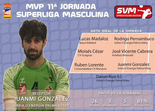 El mejor de los mejores. Ese ha sido este fin de semana Juanmi González. El voleibolista onubense ha sido designado como el MVP de la última jornada de la Superliga, la primera división del voleibol español.
