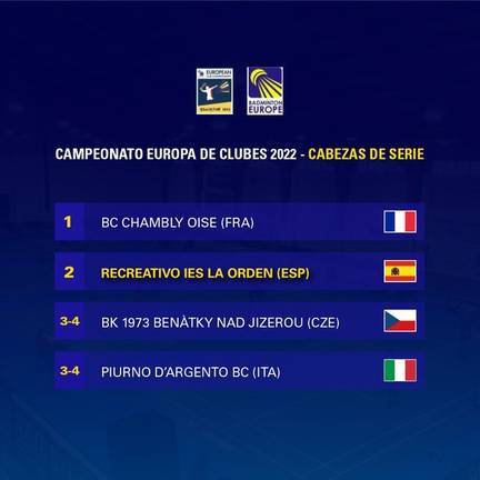 La fama del Club Bádminton IES La Orden trasciende nuestras fronteras, hasta el extremo de convertir al conjunto de Paco Ojeda en uno de los 'grandes' del Viejo Continente. De hecho, los onubenses son considerados como el segundo máximo favorito para ganar la Copa de Europa de Clubes, que se disputará en la ciudad polaca de Bialystok, del 28 de junio al 2 de julio.