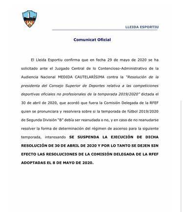 Cabe recordar al respecto, que el Lleida marchaba quinto en el Grupo III de la Segunda División B cuando se canceló la competición por culpa de la pandemia del coronavirus. Está por ver ahora que resolución adopta la justicia y si esta afecta únicamente al Grupo III o a toda la competición.
